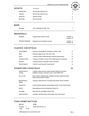 Experience our unique cocktail program that highlights Korean-inspired flavors, featuring our handcrafted soju and makgeolli. At our space, you'll savor perfectly balanced cocktails infused with the rich culinary heritage of Korea. From traditional influences to innovative twists, our drinks are designed to celebrate the vibrant spirit of Korean culture.